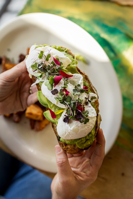 Mushrooms, spinach, bell peppers, topped with fresh salsa, avocado, sour cream.